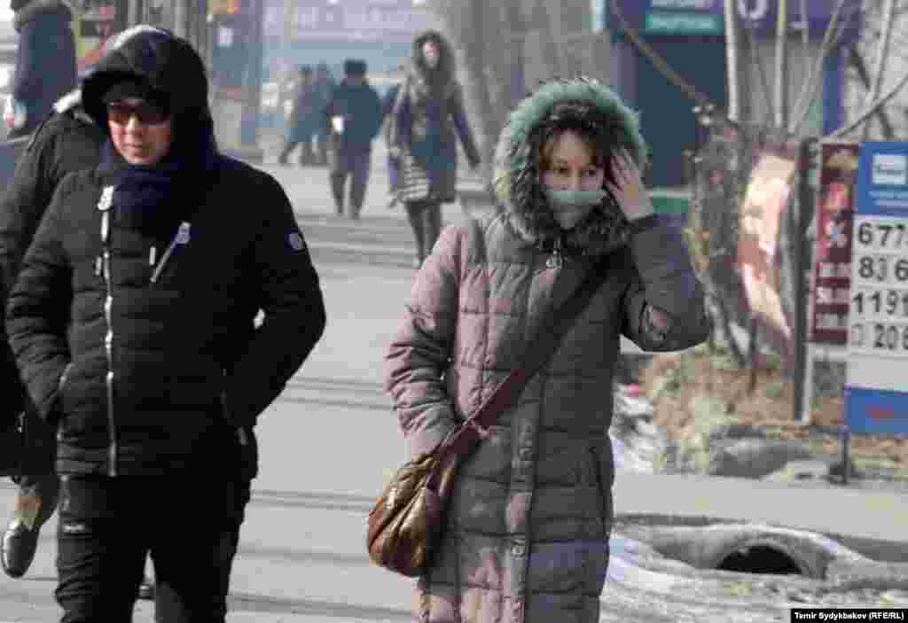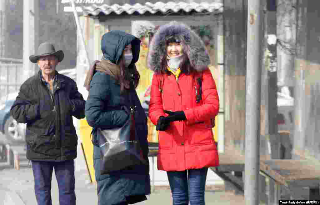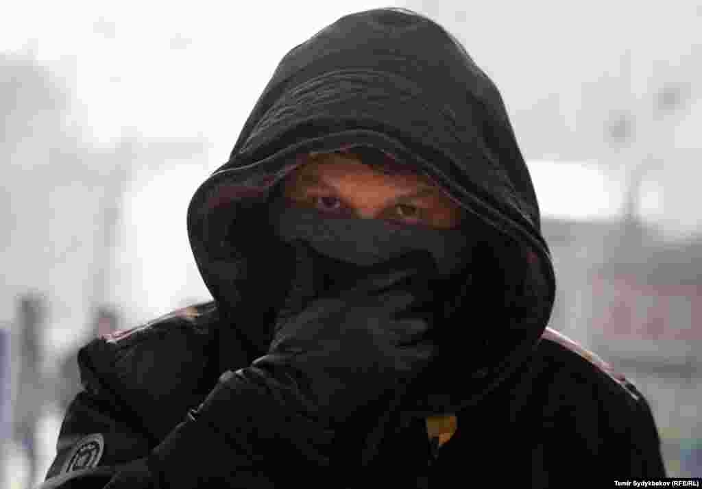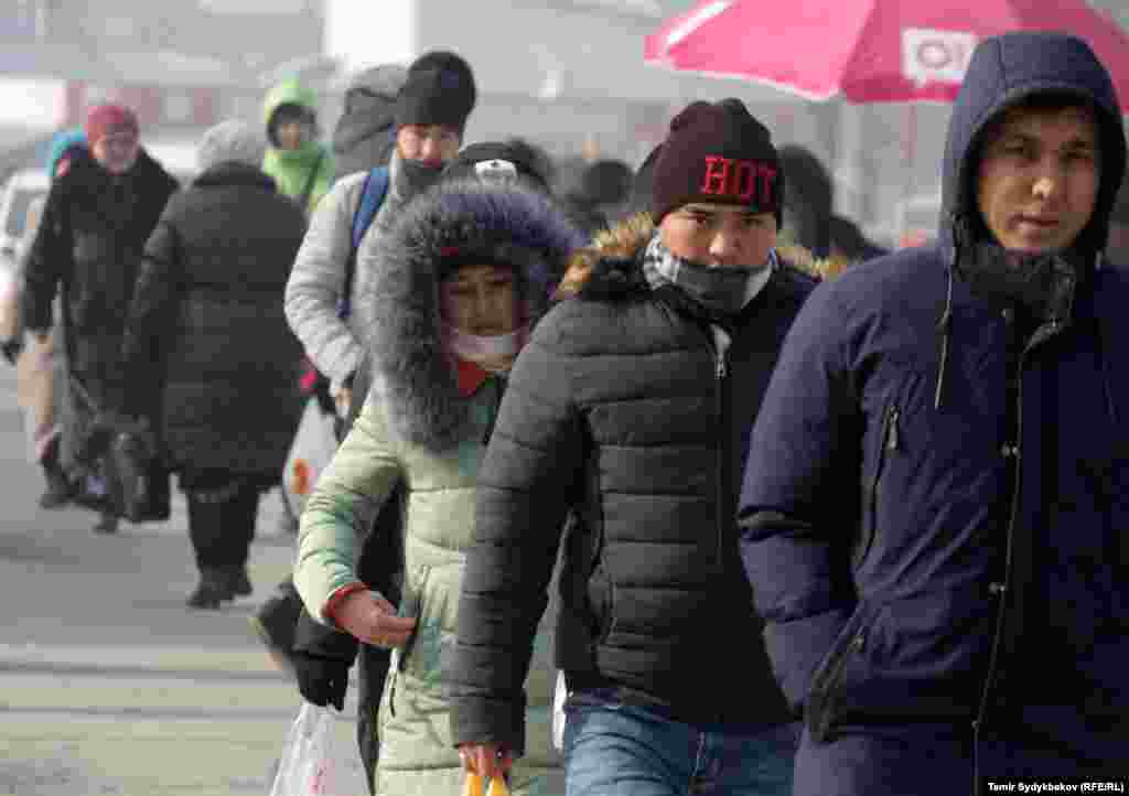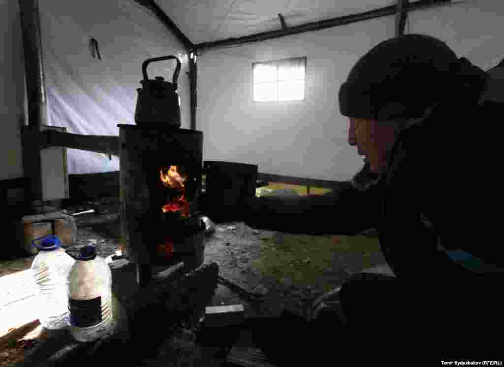 Чатырларга жолдо бараткан жөө жүргүнчүлөр жана жумушчулар жылынуу үчүн кайрылып жатышат.
